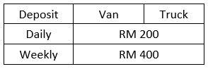 - Damage or accident, we can charge up to RM2,500 for vans and RM3,000 for trucks, not including windscreen, key and remote control, tyre and tyre rim. However, you may purchase SCDW at RM 30/day for van RM50/day for truck.